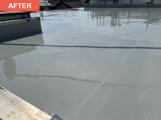 今回行った工事は、「防水工事(屋根塗装工事を含む)」「外壁改修工事(外壁塗装工事を含む)」「木工事」「白アリ工事」です。防水工事は屋根とバルコニーの笠木を交換。下地を部分改修し、ウレタン塗膜防水を施しました。施工後の屋根上の画像がその工事の様子です。ウレタン塗膜防水は2mm~3mmの厚いウレタンの膜を屋根に塗装していきます。一般的には塗り防水と言われ、ウレタン塗膜により雨漏りを解消していきます。